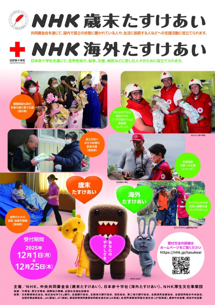 今年も、日本放送協会(NHK)及びNHK厚生文化事業団、中央共同募金会の共催により、「NHK歳末たすけあい」が12月1日からスタートしました。